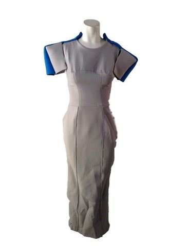 Project Runway All Stars, Season 6, Episode 5: "Fashion's New Superheroes" - Garment # 660 - Designer: Merline. The theme of the challenge was to create an elegant look that celebrates a woman's inner superhero by using a Rodial product as the secret power inspiration. Merline's design was based on Rodial's Magic Gel. She designed a mid- length, slim fitting, tailored gray dress with boxy, short sleeve, cap shoulders that are connected by a royal blue stripe.