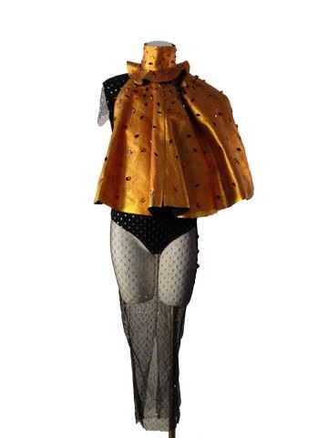 Project Runway All Stars- Season 6, Episode 7: "A Kick in the Astro" -Garment # 686 - Designer: Kimberly. This is the episode when designs were based on the cosmos, the Avant-Garde challenge. Kimberly designed a 3-piece look featuring a black leotard with a large metallic gold/orange skirt used as a cape over the head, with a see-through black and gold mesh pencil skirt. There is an additional large gold/orange collar piece. Kimberly was eliminated in this episode.