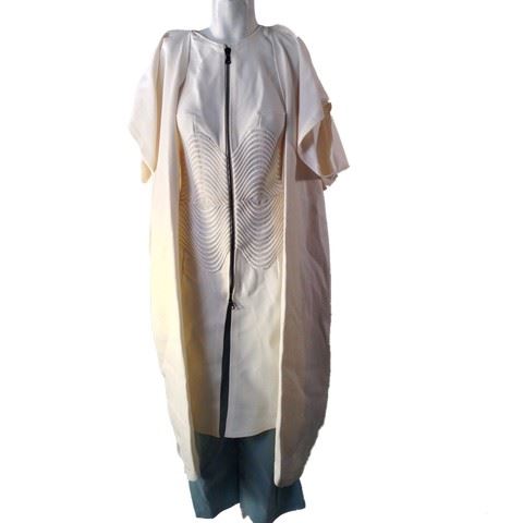Project Runway All Stars, Season 6, Episode 13: "Making Fashion History" - Garment # 730-Designer: Fabio. In the season finale, Fabio designed this for his finale collection. A 2-piece look with light blue, cropped pants and a long white vest with short sleeve jacket sewn to the top of the vest. Vest has a 2 way zipper that zips in the front with corset inset. Back of the vest has a diamond sewn design of pulled fabric. Fabio's design inspiration was the concept of time (past, present and future) with this in mind to create a look of contrast between classic and modern.