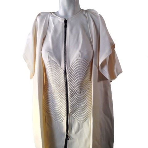 Project Runway All Stars, Season 6, Episode 13: "Making Fashion History" - Garment # 730-Designer: Fabio. In the season finale, Fabio designed this for his finale collection. A 2-piece look with light blue, cropped pants and a long white vest with short sleeve jacket sewn to the top of the vest. Vest has a 2 way zipper that zips in the front with corset inset. Back of the vest has a diamond sewn design of pulled fabric. Fabio's design inspiration was the concept of time (past, present and future) with this in mind to create a look of contrast between classic and modern.