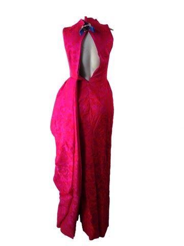 Project Runway All Stars, Season 6, Episode 9: "Posen on the Red Carpet" - Garment # 699 - Designer: Ken. Ken used sculpting as his technique for this episode. He explained on the show that he fused the stretchy fabric to create a structure in the dress. His design is comprised of a long pink and red floral print dress with a v-neck top and a section of sculpted fabric off the left hip.