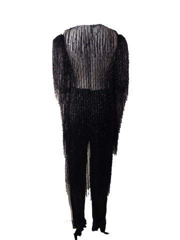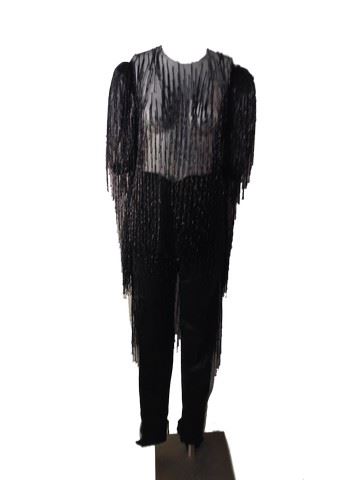 Project Runway All Stars - Season 7, Epsiode 13: The Finale - garment # 829-Designer: Dmitry. Dimitry's finale collection was inspired by his personal journey as an artist and a human being. Judges called it "masterful" and "modern". He was the runner up of the season. This look has a sheer, mesh beaded and fringed 3/4 sleeve top with mesh shoulders. Black, back zip tuxedo pants with sheer lace trim down the side of the leg that ties at the ankle complete the look.
