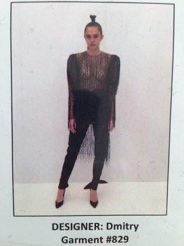 Project Runway All Stars - Season 7, Epsiode 13: The Finale - garment # 829-Designer: Dmitry. Dimitry's finale collection was inspired by his personal journey as an artist and a human being. Judges called it "masterful" and "modern". He was the runner up of the season. This look has a sheer, mesh beaded and fringed 3/4 sleeve top with mesh shoulders. Black, back zip tuxedo pants with sheer lace trim down the side of the leg that ties at the ankle complete the look.