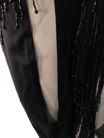 Project Runway All Stars - Season 7, Epsiode 13: The Finale - garment # 829-Designer: Dmitry. Dimitry's finale collection was inspired by his personal journey as an artist and a human being. Judges called it "masterful" and "modern". He was the runner up of the season. This look has a sheer, mesh beaded and fringed 3/4 sleeve top with mesh shoulders. Black, back zip tuxedo pants with sheer lace trim down the side of the leg that ties at the ankle complete the look.