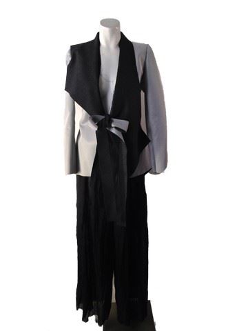 Project Runway All Stars- Season 7- Episode 1: "All Stars Goes Global" - Garment- # 707- Designer: Christina. Christina designed a black chiffon sleeveless jumpsuit, with a cape-like draped back and wide flowy pants. The jacket is a black and white tweed with a tie front and large collar. The back of the jacket has a unique laser cut design. Christina was inspired by her hometown: Australia.