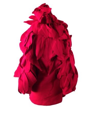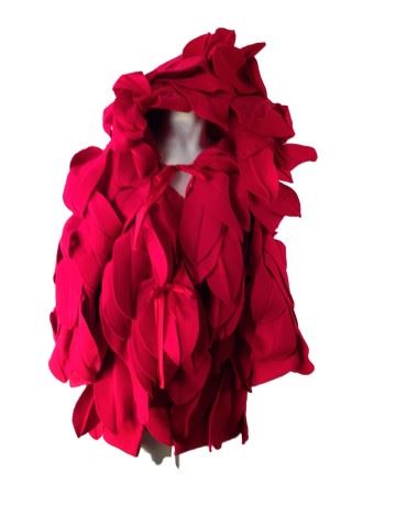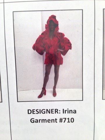 Project Runway All Stars - Season 7, Episode 1: "All Stars Goes Global" - Garment #710 - Designer: Irina. Irina scored strongly with the judges on this design. It is a merlot red cashmere jacket cut into circles and gathered together. Constructed as a mini dress with a hood. The jacket has three ties in the front and a cluster of rhinestones on both sleeves. Irina's inspiration was the Republic of Georgia, known for its wine. Judges felt it had "incredible runway appeal".
