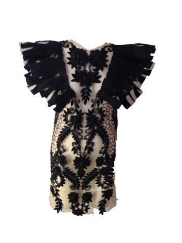 Project Runway All Stars - Season 7, Episode 13-garment # 830 - Designer: Dmitry. Dimitry's finale collection was inspired by his personal journey as an artist and a human being. Judges called it "masterful" and "modern". He was the runner up of the season. In this design he constructed a sheer nude mesh lined dress with black embroidered flowers stitched all over the dress. The top half of the dress has a black net and felt with some cut out designs that are cut to achieve a feather like appearance. There is black beading design throughout and around all the flowers.