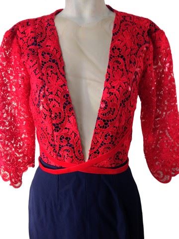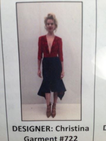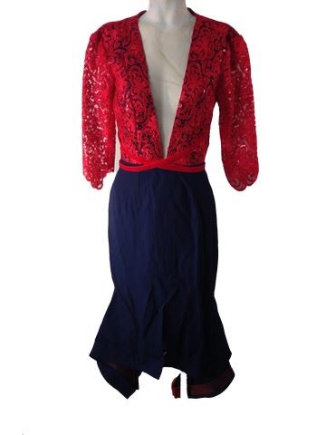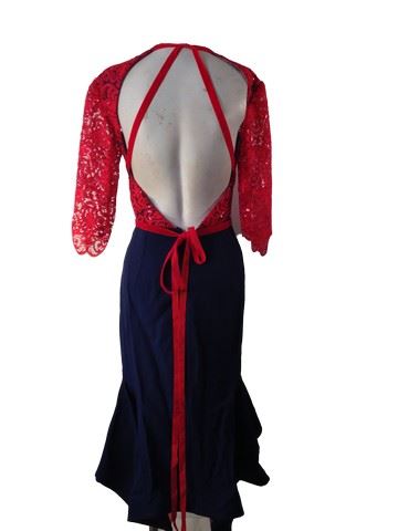 Project Runway All Stars - Season 7, Episode 2: "Graduation Celebration" - Garment #722 - Designer: Christina. This is a red sequin laced (with navy lining), 3/4 sleeved, deep v-neck dress with nude mesh screen down the front and open back. Ties at the neck with a long red felt ribbon that also ties around the waist. The navy midi skirt is beautifully hemmed with red horse hair trim reveal underneath.