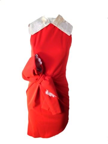 Project Runway All Stars - Season 7, Episode 2: "Graduation Celebration" - Garment #719 - Designer: Cynthia. Orange polyester/spandex sleeveless with open back and diagonal hemmed skirt dress that wraps into a big center bow trimmed with pearls and lace. A matching lace with pearl beading is also on the crème colored, removable collar. Collar has makeup stains.