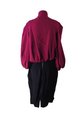 Project Runway All Stars- Season 7- Episode 12: "Modern Families"- Garment # 816- Designer: Irina. The theme of this challenge was to design three looks for a modern family. Irina's first look for this challenge is a two piece ensemble. The top is a fuschia long, blossom sleeves and drawstring front top. Going down the center of the shirt is a neon yellow stitch with hooks to fasten the top. The bottom is a leather mid-calf skirt with an elastic waist top.