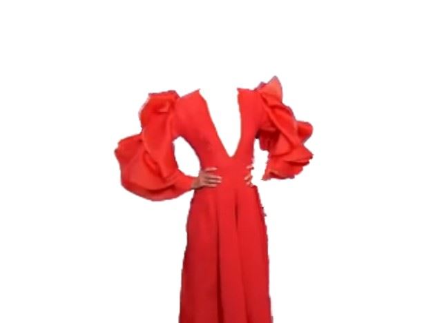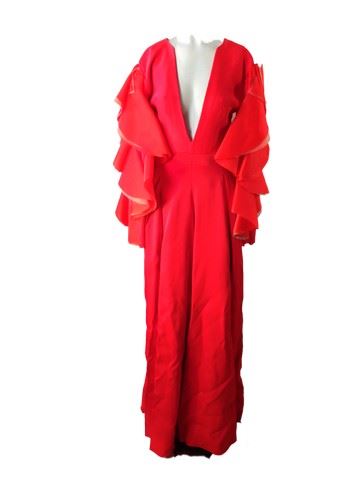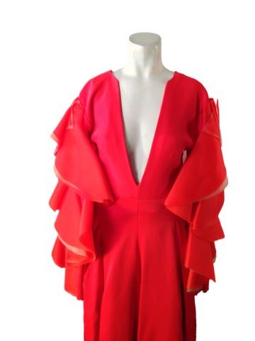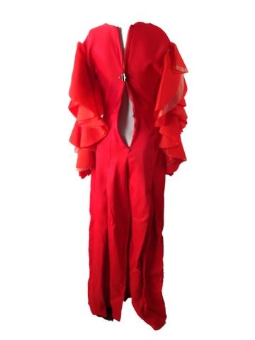 Project Runway All Stars, Season 6, Episode 5: "Fashion's New Superheroes" -Garment # 668 - Designer: Ken. The theme of the challenge was to create an elegant look that celebrates a woman's inner superhero by using a Rodial product as the secret power inspiration. Ken used Rodial's Super Acids to designed this bright and bold red, long v- neck jumpsuit with wide leg pants and long sleeves with large ruffles. Judges scored this creation high on their rankings in this episode.
