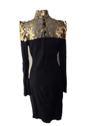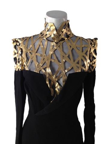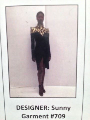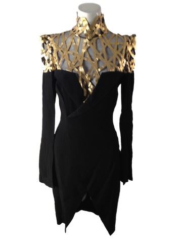 Project Runway All Stars- Season 7 -Episode 1: "All Stars Goes Global" - Garment- # 709-Designer: Sunny. Sunny designed a black, crepe, fitted long sleeve, mid thigh dress with high slit and gold leather lattice design along the neck and collar.