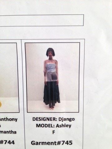 Project Runway All Stars- Season 7- Episode 4: "Corsets of Fashion- Garment # 745 - Designer: Django. Django designed a 3-piece look with a silver, satin corset that is laced in the back. It has a long sleeve tunic cape made out of organza with dark printed lines and green, flowing satin pants complete this ensemble. For this design, Django wanted to play with "the idea of harsh lines with organic shapes".