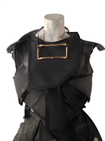 Project Runway All Stars, Season 6, Episode 2: "Damsels in Distress" - Garment # 626 - Designer: Merline. Merline used a blowtorch, sander and spray paint to construct this look. She designed a short and structured dark gray sleveless dress and open back, made with stiff mesh and hard plastic boning to create geometrical shapes. Material is ripped and dripped with black wax. Additional gold metal eye piece included.