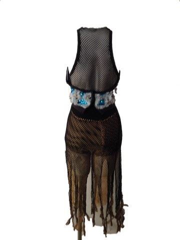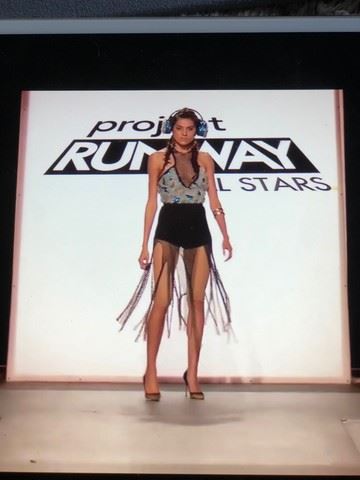 Project Runway All Stars, Season 6, Episode 2: "Damsels in Distress"- Garment # 622 -Designer: Kelly. Kelly used a grater and utility knife to design this ensemble. Kelly designed a black fishnet muscle tank cut, V design top with blue fur and sequined bodice. The fishnet continues to the bottom and was cut into strips and sprayed gold. Black spandex shorts and nude netted shorts accompany this silhouette. Kelly was eliminated in this episode.