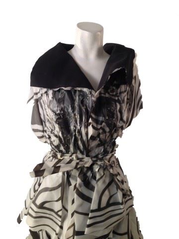 Project Runway All Stars, Season 6, Episode 2: "Damsels in Distress" - Garment # 627 -Designer: Fabio. Fabio used bleach and a blowtorch to construct this look. He designed 2 -piece look with gray and black mottled denim capri pants, plus an opaque, black and white zebra print cover up, cinched at the waist with bardot style top and an oversized, black collar. Melted detailing and additional plastic belt to tie around the waist are included.