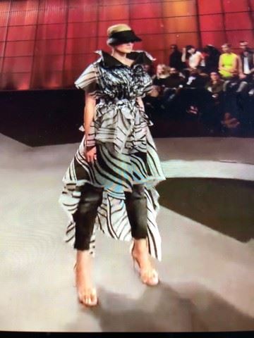 Project Runway All Stars, Season 6, Episode 2: "Damsels in Distress" - Garment # 627 -Designer: Fabio. Fabio used bleach and a blowtorch to construct this look. He designed 2 -piece look with gray and black mottled denim capri pants, plus an opaque, black and white zebra print cover up, cinched at the waist with bardot style top and an oversized, black collar. Melted detailing and additional plastic belt to tie around the waist are included.