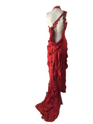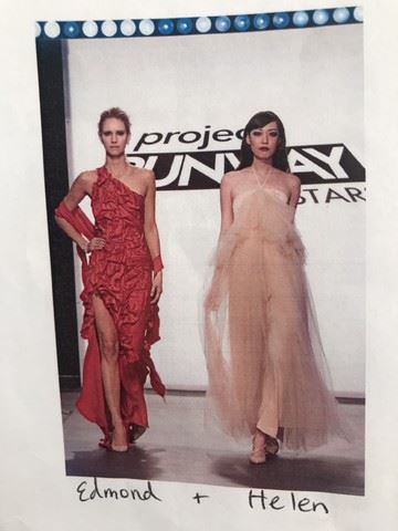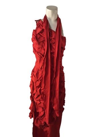 Project Runway All Stars- Garment # 636- Season 6, Episode 3. Designer: Edmond. In this episode, Edmond designed a long red one-shoulder dress with appliqué details on the upper back, and ruffling on the front and the back of the dress. Additional red shawl to drape over the arms.