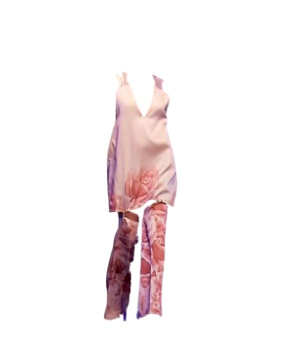 Project Runway All Stars, Season 6, Episode 5: "Fashion's New Superheroes" - Garment # 662, Fashion's New Superheroes, Designer: Kimberly. The theme of the challenge was to create an elegant look that celebrates a woman's inner superhero by using a Rodial product as the secret power inspiration. Kimberly's inspiration was Illuminating. She designed a 3-piece, blush pink, v-neck sleeveless, knee length dress with pockets, with two pant legs that are attachable by large gold safety pins. The fabric features a large print of a rose.