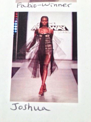 Project Runway All Stars, Season 6, Episode 5: "Fashion's New Superheroes" -Garment # 667, Fashion's New Superheroes, Designer: Joshua. The theme of the challenge was to create an elegant look that celebrates a woman's inner superhero by using a Rodial product as the secret power inspiration. Joshua's inspiration was concealer. He designed a 3-piece look featuring a lacy off-white with black outlined detail corset with matching garter. The piece has an outer overlay made of black tulle with boning to bring the essence of the "conceal".