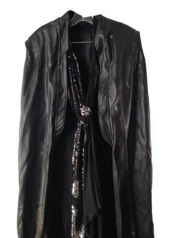 Project Runway All Stars, Season 6, Episode 5: "Fashion's New Superheroes" -Garment # 658 -Designer: Edmond. The theme of the challenge was to create an elegant look that celebrates a woman's inner superhero by using a Rodial product as the secret power inspiration. Edmond used Rodial's Contouring product as his inspiration for this ensemble. His superpower was to give confidence to those who were unaware of what they were capable of doing. It is a 2 -piece look with a stretchy, long black dress that has dark silver sequins and side cutouts at the torso. Comes with an unattached, long black faux leather cape with enhanced shoulders. This design ranked low with the judges because it felt as though it had been done before.