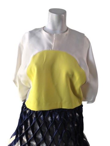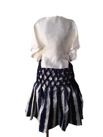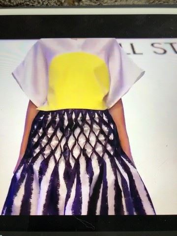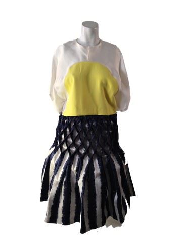 Project Runway All Stars, Season 6, Episode 13: "Making Fashion History" - Garment# 726 -Designer: Fabio. Fabio designed this 2-piece look with a white and navy striped pleated skirt and a yellow and off-white short sleeve crop top with a yellow circle in the front. This was part of his finale collection. Inspired by the concept of time (past, present and future) with this in mind to create a look of contrast between classic and modern.