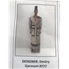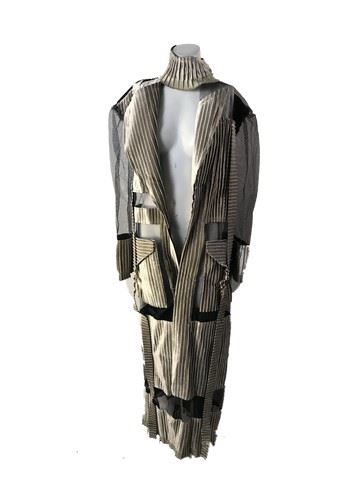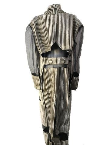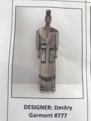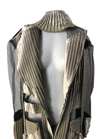 Project Runway All Stars, Season 7, Episode 7: "Pure Imagination" - Garment # 777 - The Avant-Gard Challenge - Designer: Dmitry. Dmitry designed a taupe crushed velvet and black net trench coat with gold buckles on the front and sheer mesh sleeves. The coat is cut out at the waist and cropped in the back so that it fits with his theme of temperature control clothing.