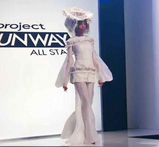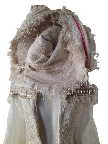 Project Runway All Stars, Season 7, Episode 7: "Pure Imagination" -Garment # 774 - The Avant Garde Challenge - Designer: Django. Django designed a gold and cream tweed jumpsuit with sheer, cream colored arms to match the palazzo pant legs. The tweed body is embellished with fringe and beads. The hat is made with three hats together to be worn as one and matches the tweed material of the jumpsuit. Django was elminiated in this episode because it didn't quite meet the criteria of Avant Garde.