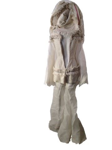 Project Runway All Stars, Season 7, Episode 7: "Pure Imagination" -Garment # 774 - The Avant Garde Challenge - Designer: Django. Django designed a gold and cream tweed jumpsuit with sheer, cream colored arms to match the palazzo pant legs. The tweed body is embellished with fringe and beads. The hat is made with three hats together to be worn as one and matches the tweed material of the jumpsuit. Django was elminiated in this episode because it didn't quite meet the criteria of Avant Garde.