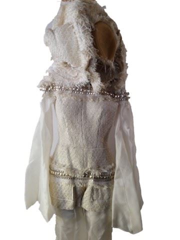 Project Runway All Stars, Season 7, Episode 7: "Pure Imagination" -Garment # 774 - The Avant Garde Challenge - Designer: Django. Django designed a gold and cream tweed jumpsuit with sheer, cream colored arms to match the palazzo pant legs. The tweed body is embellished with fringe and beads. The hat is made with three hats together to be worn as one and matches the tweed material of the jumpsuit. Django was elminiated in this episode because it didn't quite meet the criteria of Avant Garde.