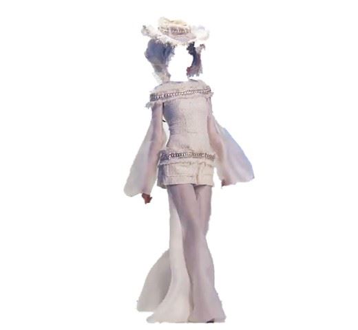 Project Runway All Stars, Season 7, Episode 7: "Pure Imagination" -Garment # 774 - The Avant Garde Challenge - Designer: Django. Django designed a gold and cream tweed jumpsuit with sheer, cream colored arms to match the palazzo pant legs. The tweed body is embellished with fringe and beads. The hat is made with three hats together to be worn as one and matches the tweed material of the jumpsuit. Django was elminiated in this episode because it didn't quite meet the criteria of Avant Garde.