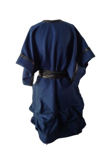 Project Runway All Stars - Season 7, Episode 13 - Garment #837 -Finale- Designer: Irina. Irina was inspired by femininity and the strength of the modern woman. Irina designed a blue wool with pleather trim jacket, tied around the waist. This is a short, bell sleeved coat that can be worn as a dress or coat. The bottom has triangular pleats sewn together to give that fabric a full appearance. Includes a large, black pleather tie that is worn off the side in a large bow.