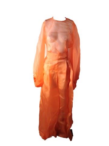 Project Runway All Stars - Season 7, Episode 13: The Finale - Garment #834 -Designer: Michelle. Michelle's title was "Harvest Mood" inspired by Baroque 1970's textural looks inspired by a romance novel. Michelle designed this 2-piece look with a sheer, orange oversized top that has puffy sleeves and inverted cuffs. Matching high waisted pants complete the look. This entire look is sheer and the pants are wide leg with an extra lining.