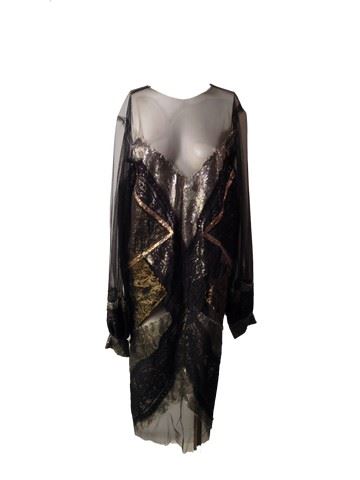Project Runway All Stars - Season 7, Episode 13: The Finale - Garment #836 Designer: Michelle. Michelle's title was "Harvest Mood" inspired by Baroque 1970's textural looks inspired by a romance novel. Michelle designed this one piece, long sleeve mini dress with open sheer panel down the front and in the back. It has oversized sleeves that gather at the cuffs and is embossed all over with sequins and lace. The design also has patch work pieces that have black with gold speckles and brown and black pieces with a gold shimmer. Some of the patchwork is frayed.
