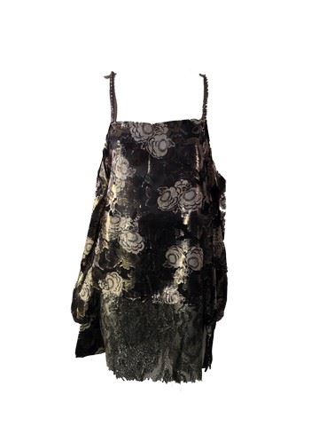 Project Runway All Stars - Season 7, Episode 13: The Finale - Garment #835 - Designer: Michelle. Michelle's title was "Harvest Mood" inspired by Baroque 1970's textural looks inspired by a romance novel. This 3-piece look includes a green polyester jacket netting overlaid and accented with black leather and sequins to match the skirt. The top is mid thigh length with sheer black and gold floral pattern. The straps are beaded and it is an open shoulder with oversized sleeves design. The skirt is a sequenced mini that zips up the back with a small slit.