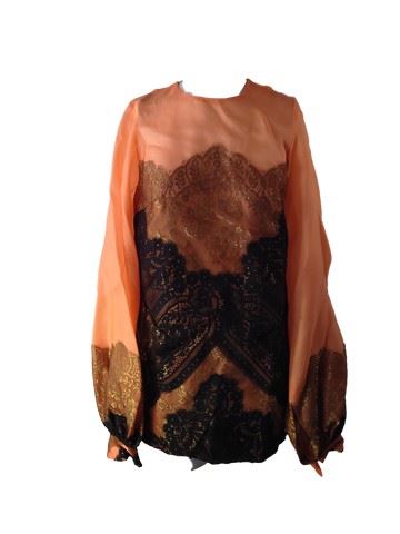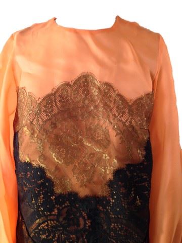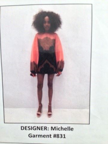 Project Runway All Stars - Season 7, Episode 13: The Finale - Garment #831 Designer: Michelle. Michelle's title was "Harvest Mood" inspired by Baroque 1970's textural looks inspired by a romance novel. Michelle designed this sheer, one piece, peach colored mini dress with gold and blue lace overlay.