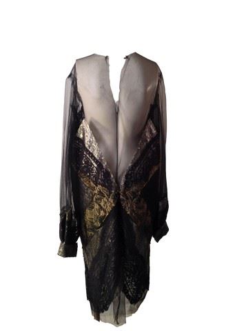 Project Runway All Stars - Season 7, Episode 13: The Finale - Garment #836 Designer: Michelle. Michelle's title was "Harvest Mood" inspired by Baroque 1970's textural looks inspired by a romance novel. Michelle designed this one piece, long sleeve mini dress with open sheer panel down the front and in the back. It has oversized sleeves that gather at the cuffs and is embossed all over with sequins and lace. The design also has patch work pieces that have black with gold speckles and brown and black pieces with a gold shimmer. Some of the patchwork is frayed.