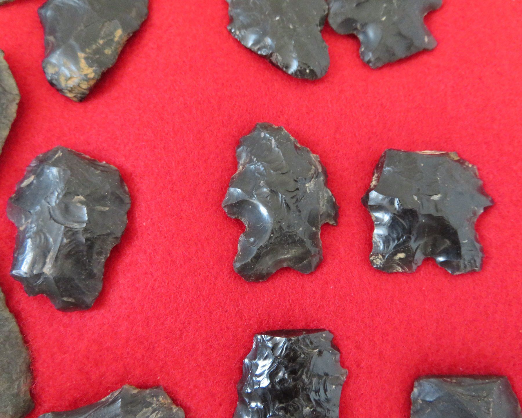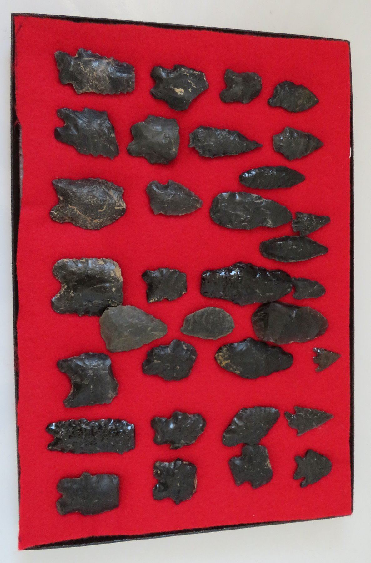 Projectile Points, paleo to archaic periods. Made of obsidian, the largest measures 2" 1/4. Sutter County, California. Many paleos. Frame not included. Condition: As found, many damaged, see images. Shipping: $20.50 w/insurance and signature.
