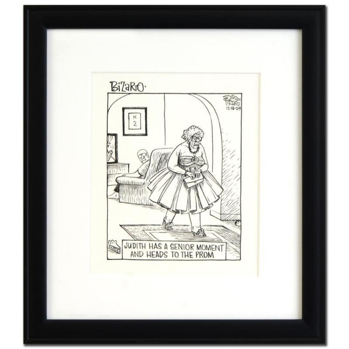 Enter a surreal and satirical world of twisted imagination and award winning creativity. "Prom" is an original pen & ink drawing on paper by Dan Piraro, creator of the critically acclaimed and award winning comic strip, Bizarro! This piece is hand signed and comes framed. Includes Certificate of Authenticity! Measures approx. 13" x 14" (with frame), 6" x 7" (image).