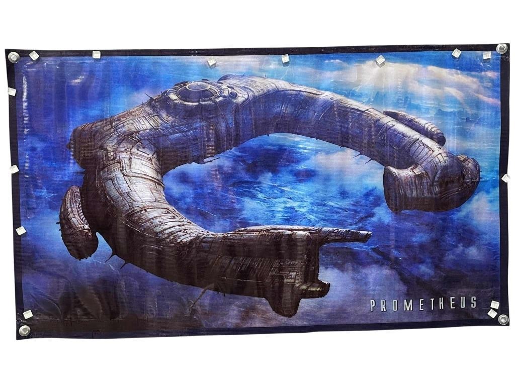 Original large vinyl poster banner from the Ridley Scott directed science fiction film 'Prometheus' (2012), where following clues to the origin of mankind, a team finds a structure on a distant moon, but they soon realize they are not alone.