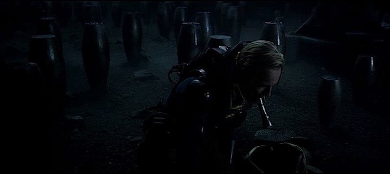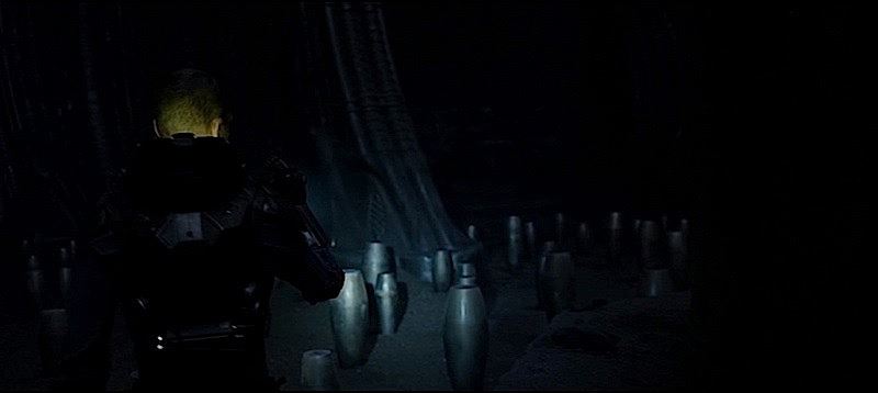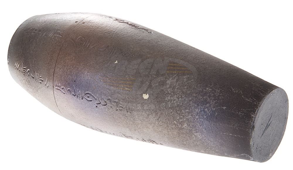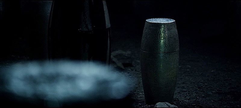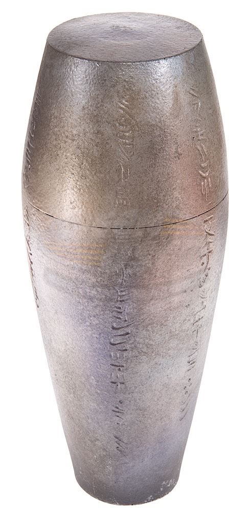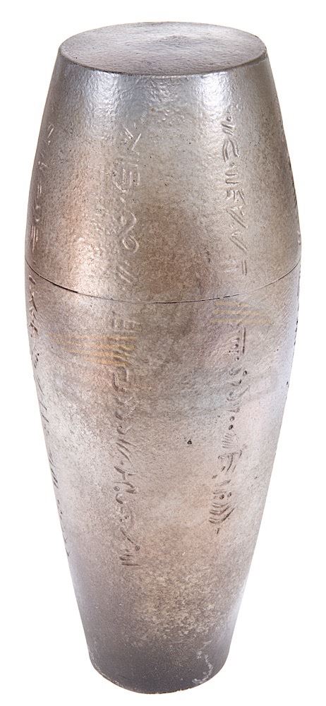 (20th Century Fox, 2012) This ampule was custom-made by the production for use as set dressing. Three different sizes of these memorable pieces were made and seen in the Ampule Chamber, this being a small sized version standing 17" tall x 6" in diameter. Made of hard biscuit foam and featuring alien text etched vertically into the body, with custom metallic paint effect incorporating silver, gold and brass colors. Minor wear from use is present.