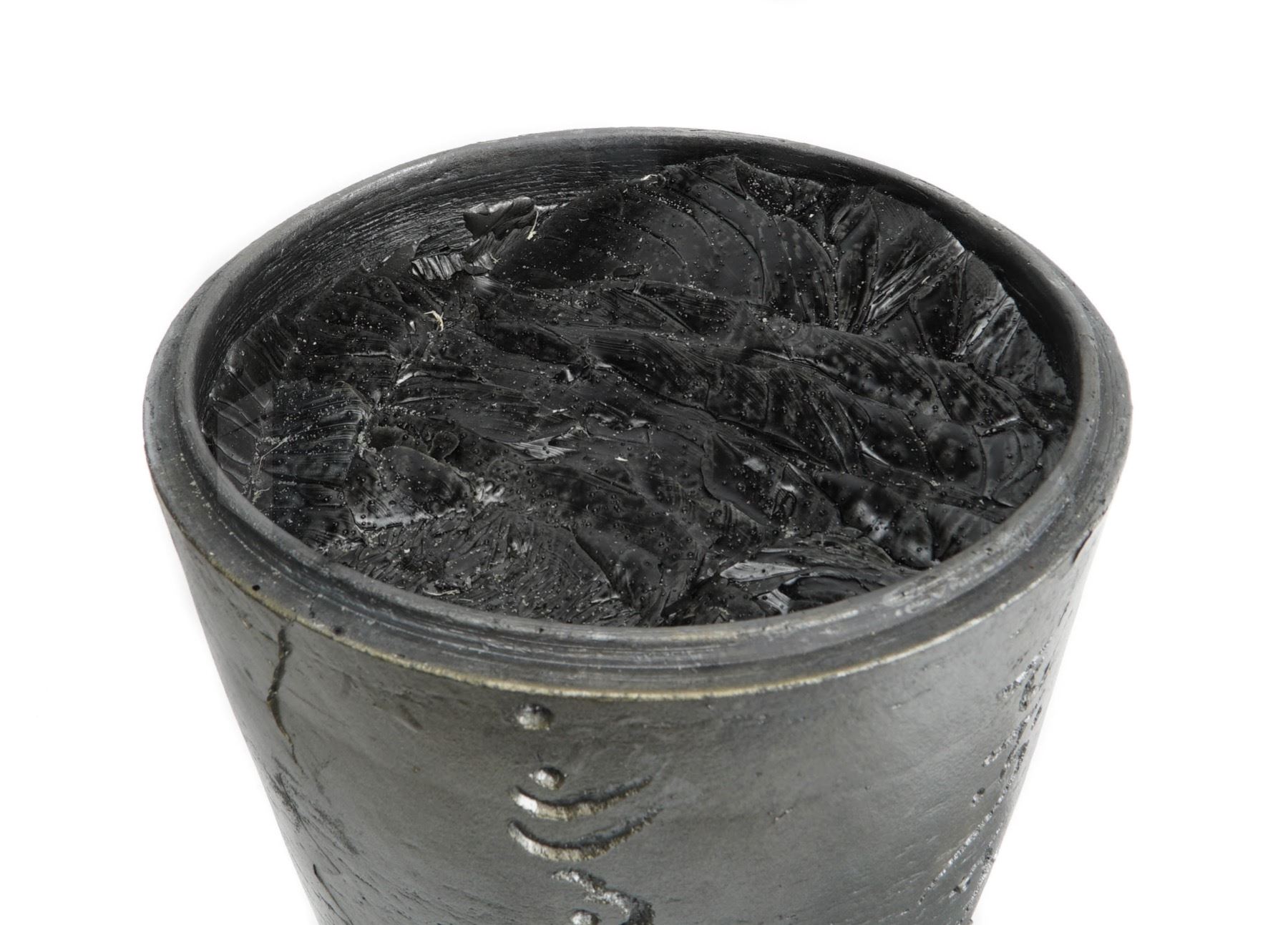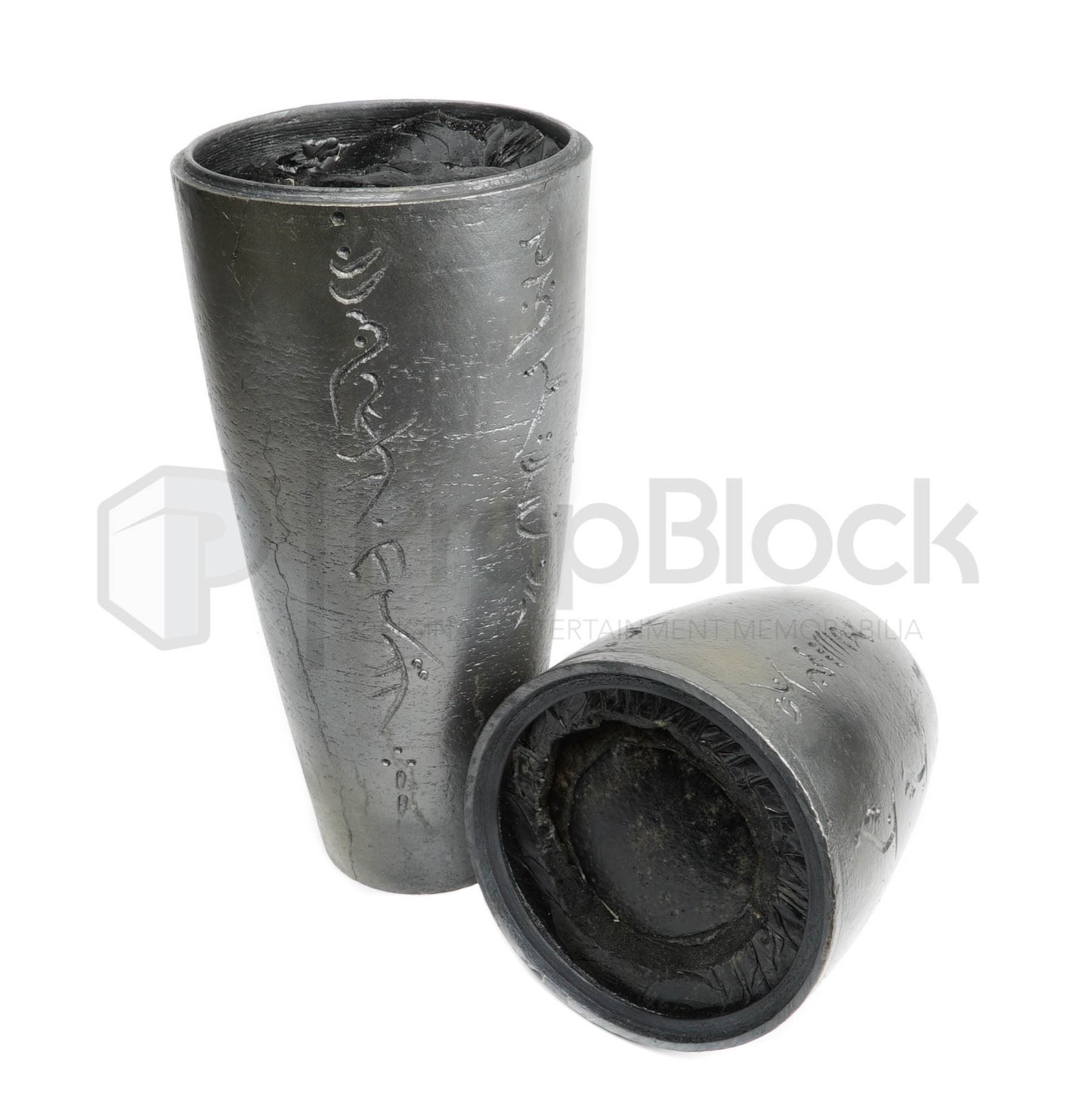 Open style ampule featured in the 2012 Ridley Scott science fiction film Prometheus. Following clues to the origin of mankind, a team finds a structure on a distant moon, but they soon realize they are not alone. This rare style of the ampule features a removable lid with a inside "layer" where the black alien substance would be concealed. This piece is made of a dense foam and fiberglass and features a bronze gold paint scheme with carved in alien lettering on the outside of the ampule. This is one of the medium sized ampules used in the film and remaisn in excellent, production used condition.
