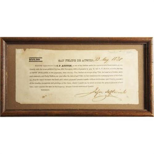 <B>[Stephen F. Austin] Partly Printed Document</B></I>. Being a printed form for a promissory note. [San Felipe de Austin: G. B. Cotton, 1829]. May 13, 1830, 1 p., oblong 16mo. Signed by Jesse Leftwich. Light soiling and browning, with occasional minor chips at edges. Matted and framed, under glass. Fine and desirable.<BR><BR>This promissory note, completed in manuscript, begins: <I>$50.00 San Felipe de Austin,</B></I> [13 May 1830] <I>Having been Received by S. F. Austin, as One of the Settlers under His Contracts with Government, in Conformity with the Terms Published by Him, 20th November, 1829: I Promise to Pay to Said S. F. Austin....</B></I> <BR><BR>On March 22, 1822, a group of Nashville citizens, calling themselves the Texas Association, made a formal request to the Mexican government for permission to settle in Texas. Robert Leftwich, their most active member, eventually did obtain a contract to settle 800 families along the Navasota River, but by the time it was awarded (April 15, 1825) the Association had run out of money. Using his own funds, Leftwich got the contract in his name, as well as the authority to form a militia within the colony. <BR><BR>Upon his return to Tennessee, he sold the contract to the Texas Association on the condition that the tract be known ever after as Leftwich's Grant. Failing health prevented Leftwich from returning to take claim of his namesake colony and little is known of his subsequent activities. Late in the summer of 1826, claims against him in the court of San Augustine ultimately resulted in the colony being renamed Robertson's Colony.<BR><BR>Little is known of Jesse Leftwich, other than his Pittsylvania County, Virginia mercantile business partnership with his brother (1802-1806), but as evidenced by this document, it is clear that Jesse eventually arrived at the Texas colony originally granted to his brother. <BR><BR>The value of this piece lies not only in its association to Stephen Austin and Robert Leftwich, but also in the fact that it is the first printing of an early Texas imprint, the tenth item recorded by Streeter as having been printed in Texas. <BR><BR><B>Reference:</B></I> Streeter 10 (locating three copies: two in Texas and one at Yale).<BR><BR><b>Shipping:</b> Books & Catalogs (<a target="_blank" href="http://www.heritageauctions.com/common/shipping.php">view shipping information</a>)