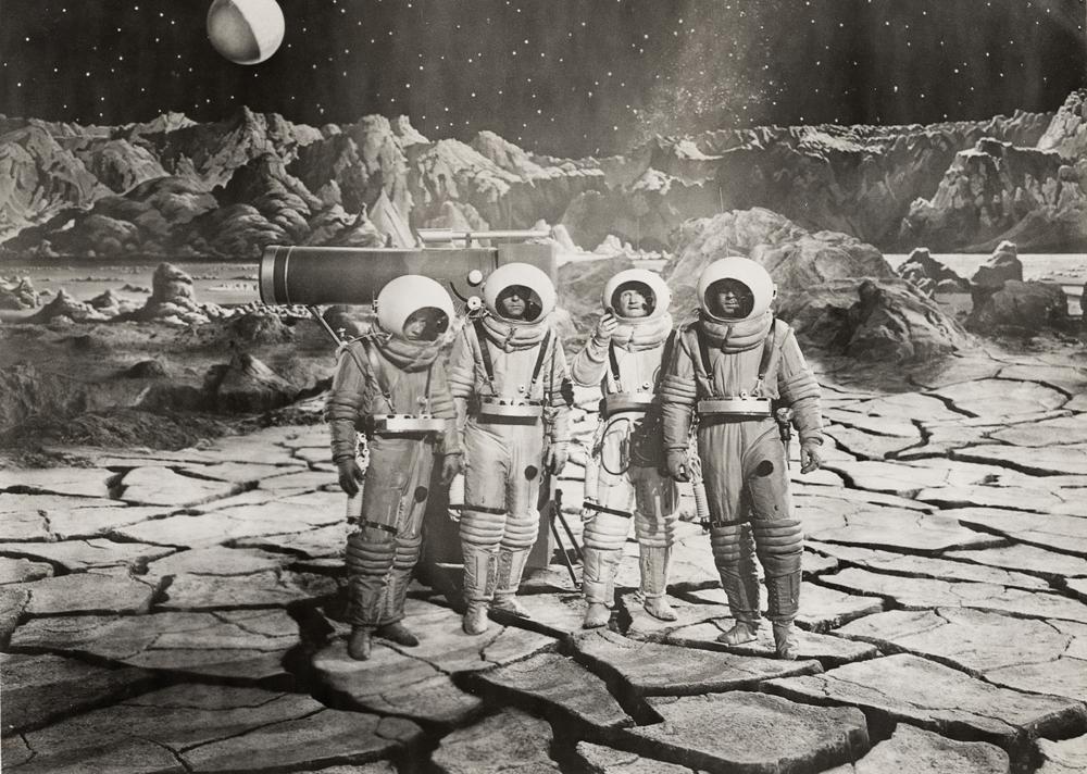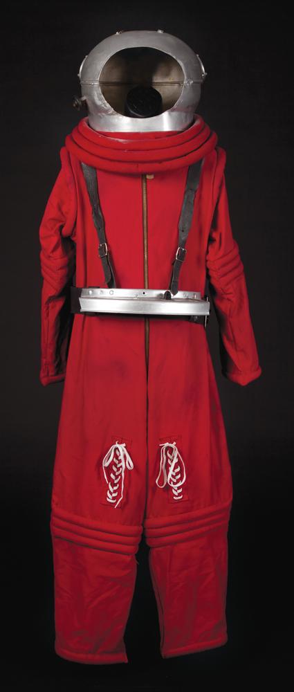 (Eagle-Lion Films, 1950) This signature space suit was used as a promotional piece by the production company, Eagle-Lion Films, for the films Destination Moon and The Day the Earth Stood Still and was displayed at select theaters during its initial run. It includes a red heavy canvas space suit (replica), aluminum space helmet with integrated cloth collar, leather belt and strapping with integrated control panel, and prop air tanks. The original components show slight wear but remain in very good condition. Includes the original 22 in. x 21 in. x 15 in. shipping case with Destination Moon label on the front.