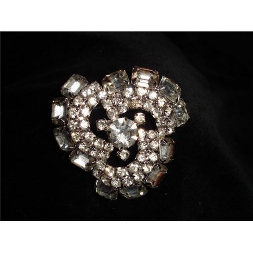 This is for a Clear/Crystal Prong Set Rhinestone Brooch. It is three arcs that looks like swirls. On the outer edge are large rectangular rhinestones, 4 to each arc. Next part of arc is 2 rows of regular sized rhinestones. There are 16 in these two rows. In the center is a large diamond colored crystal, with 3 small rhinestones attached like a triangle. This is unsigned. Very shiny and clean.