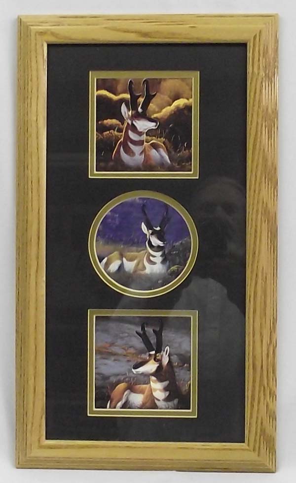 Pronghorn Antelope Pictures, framed in an oak frame, under glass. Largest picture visual measures approx. 4 1/2''H x 4 1/2''W. Inside frame measures approx. 19 1/2''H x 9 1/2''W. Buyers Pay Actual Shipping and Handling Charges(see terms and conditions for more information).