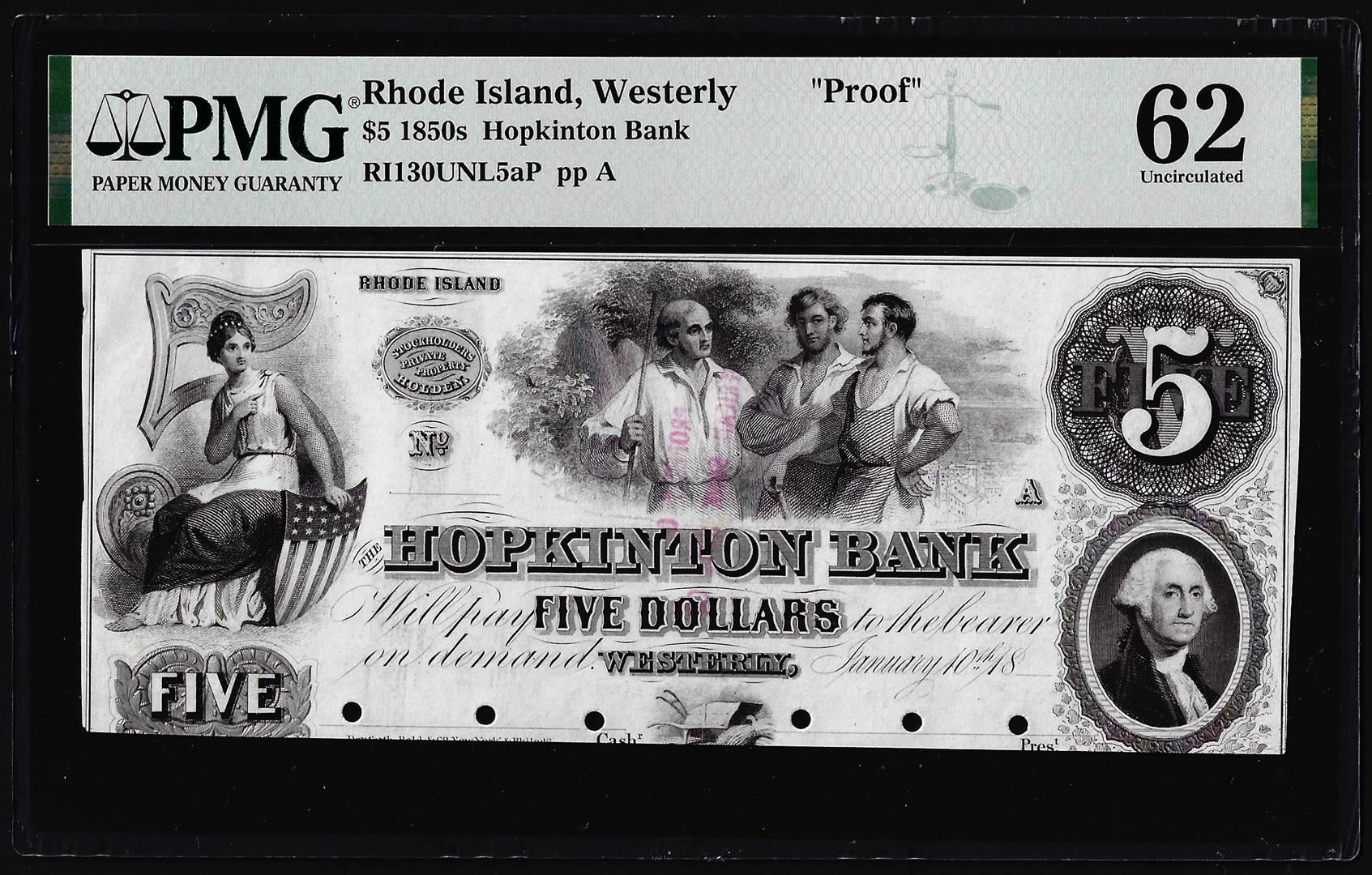 One Proof 1800's $5 Hopkinton Bank Westerly, RI Obsolete Note PMG Choice Uncirculated 62. PMG Certified.