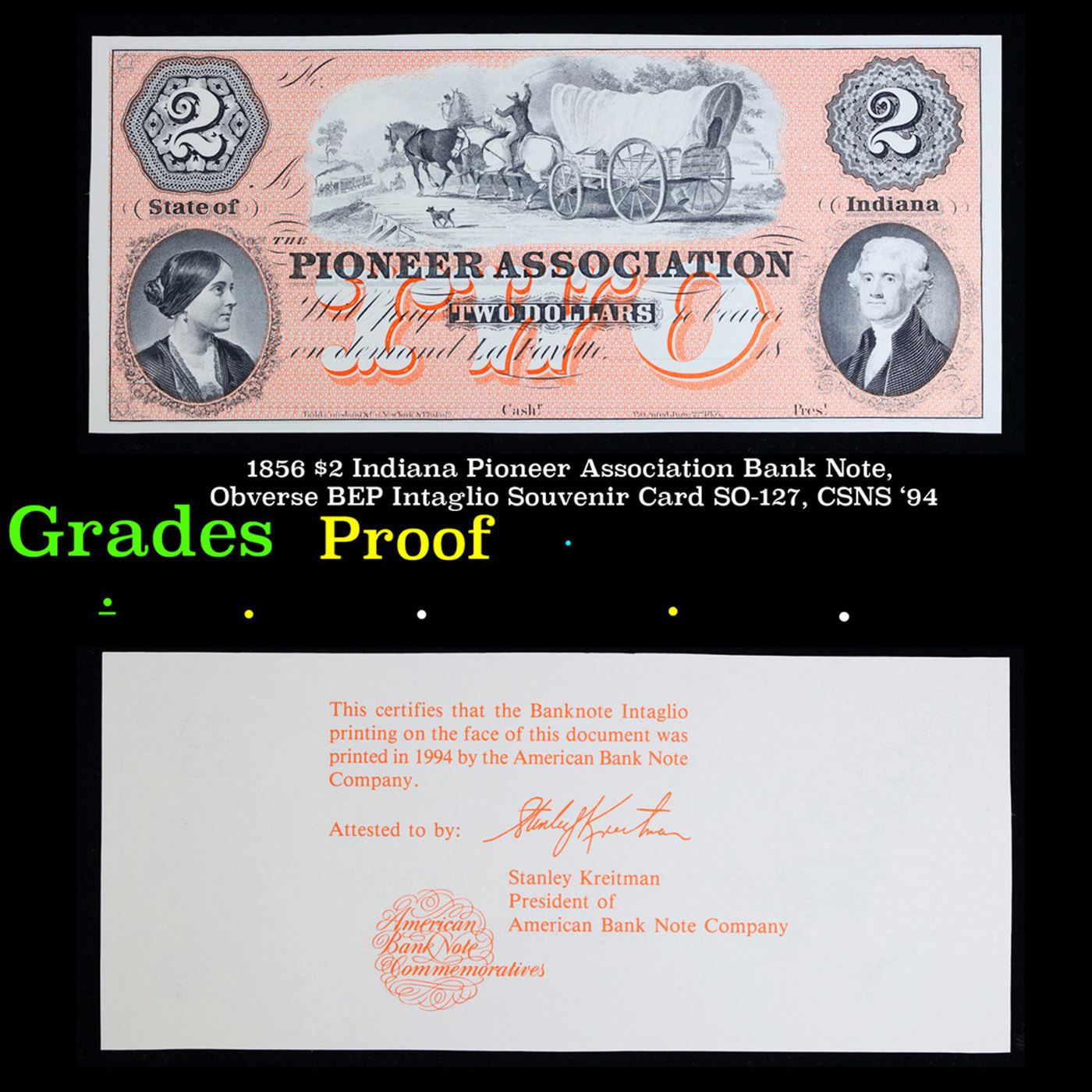 1856 $2 Indiana Pioneer Association Bank Note, Obverse BEP Intaglio Souvenir Card SO-127, CSNS '94 Grades Proof. Up for auction is a Bureau of Engraving and Printing (BEP) Proof Print . It is printed using the original Plates from the Bureau of Engraving and Printings archives. It was printed on two separate strikes, for the front and the back. It lacks serial numbers, but otherwise is a perfect proof of the Incredibly rare Piece of Currency A Corey's Pick