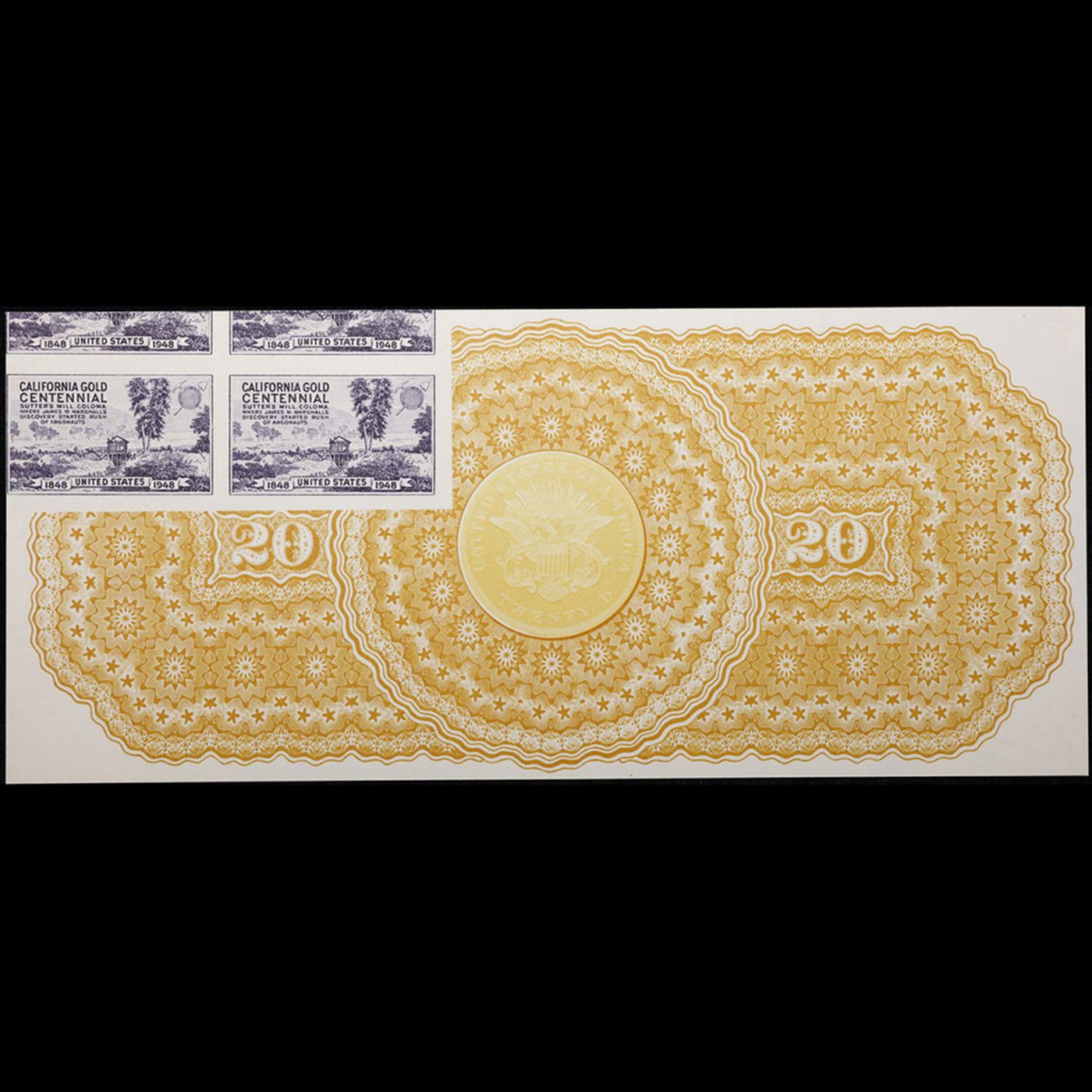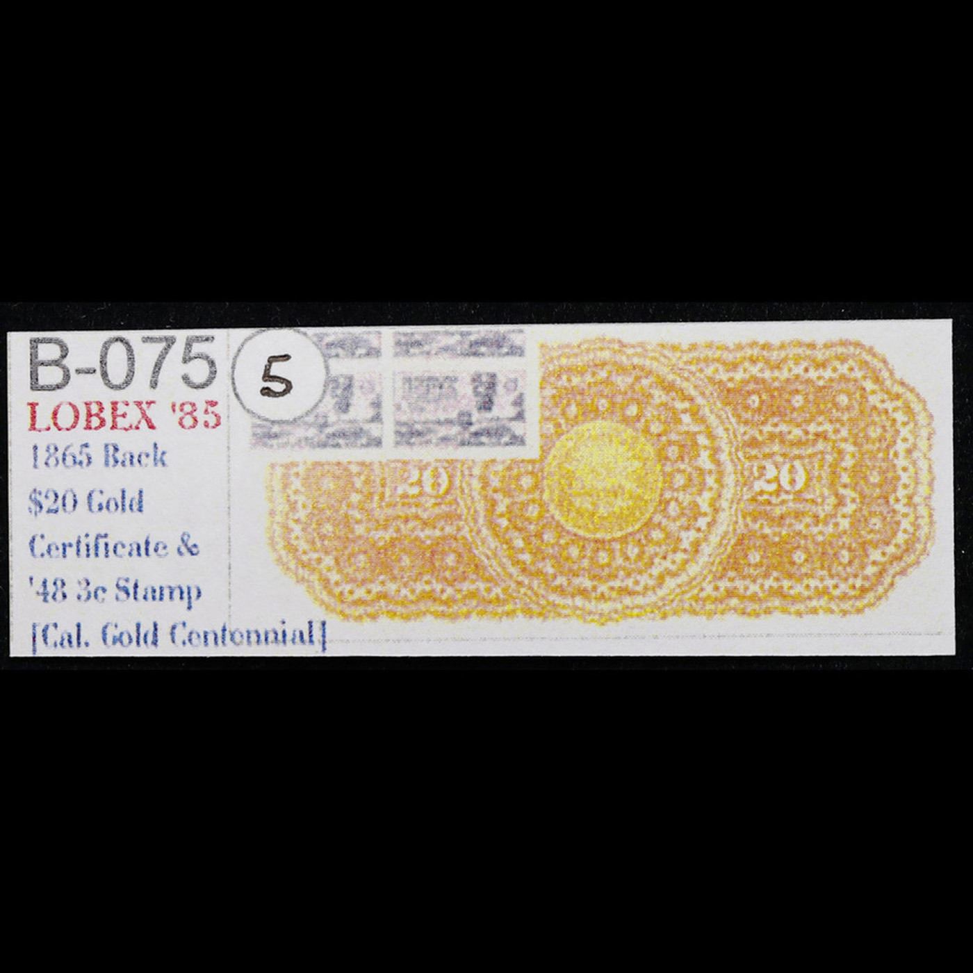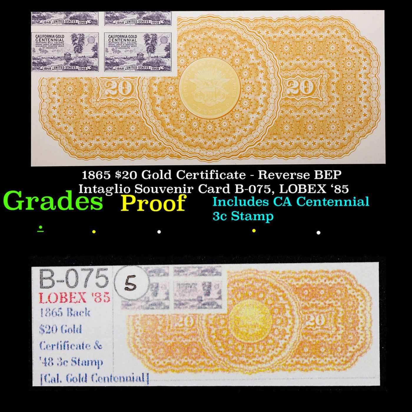 1865 $20 Gold Certificate - Reverse BEP Intaglio Souvenir Card B-075, LOBEX '85 Grades Proof. Up for auction is a Bureau of Engraving and Printing (BEP) Proof Print . It is printed using the original Plates from the Bureau of Engraving and Printings archives. It was printed on two separate strikes, for the front and the back. It lacks serial numbers, but otherwise is a perfect proof of the Incredibly rare Piece of Currency A Corey's Pick