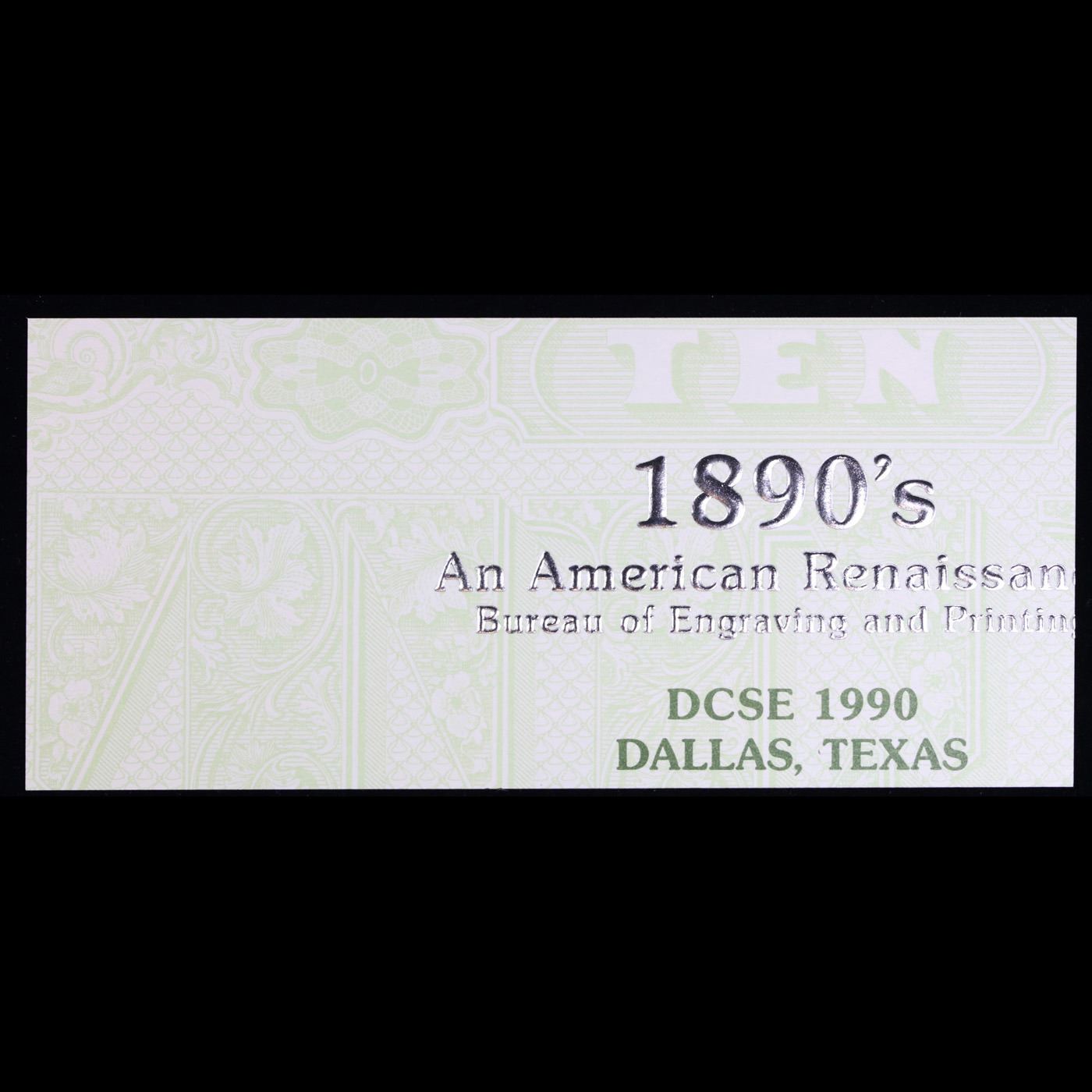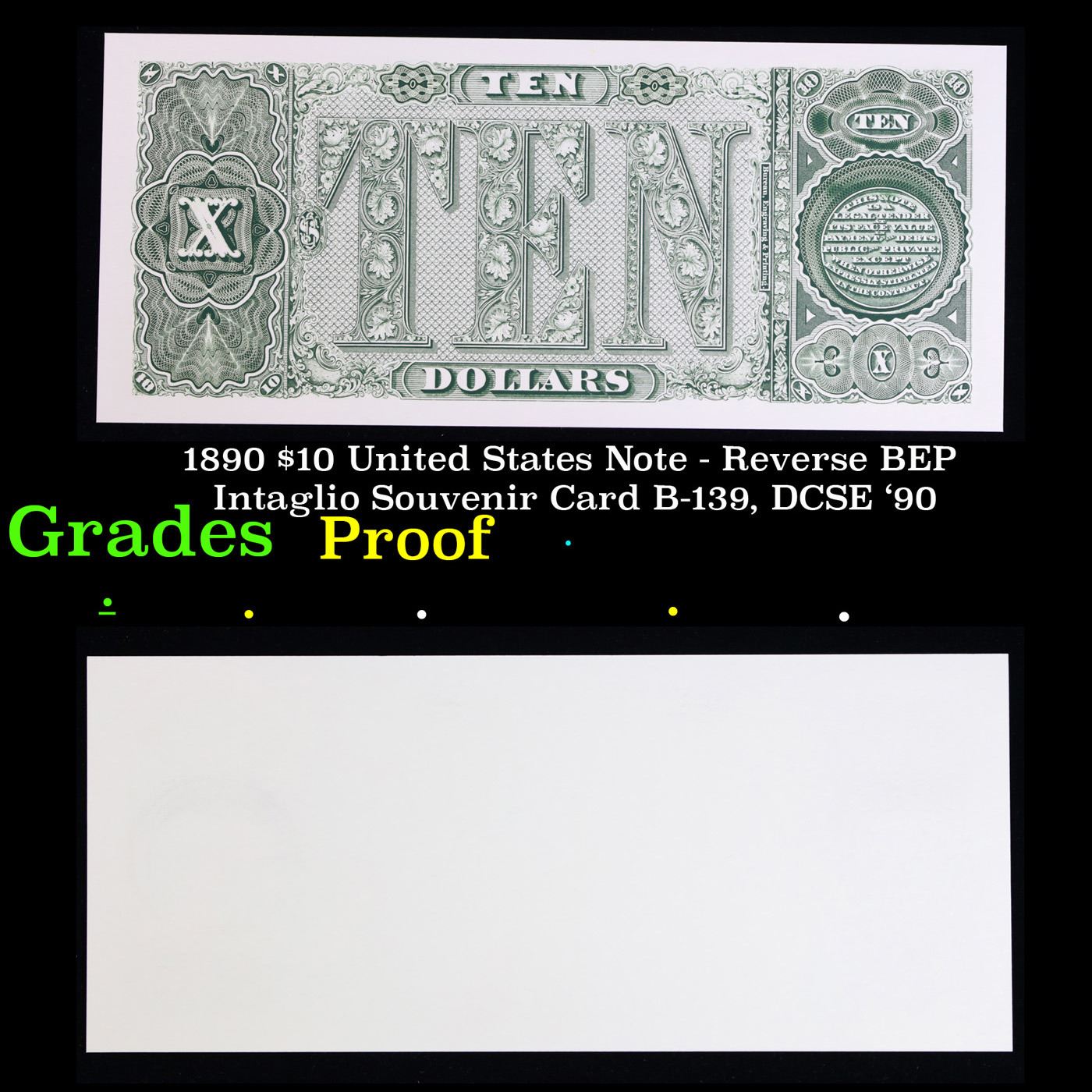 1890 $10 United States Note - Reverse BEP Intaglio Souvenir Card B-139, DCSE '90 Grades Proof. Up for auction is a Bureau of Engraving and Printing (BEP) Proof Print . It is printed using the original Plates from the Bureau of Engraving and Printings archives. It was printed on two separate strikes, for the front and the back. It lacks serial numbers, but otherwise is a perfect proof of the Incredibly rare Piece of Currency A Corey's Pick